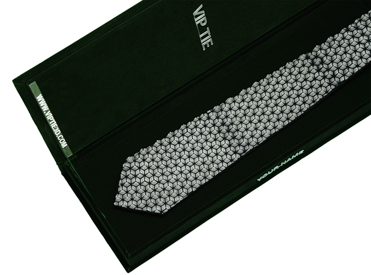 “VIP TIE combines first class luxury with an innovative high tech design. A complex combination of several complementary processes, Hand-Crafting, Embroidery, 3D Printing, and other fine rare materials joined together in a single unique product.”